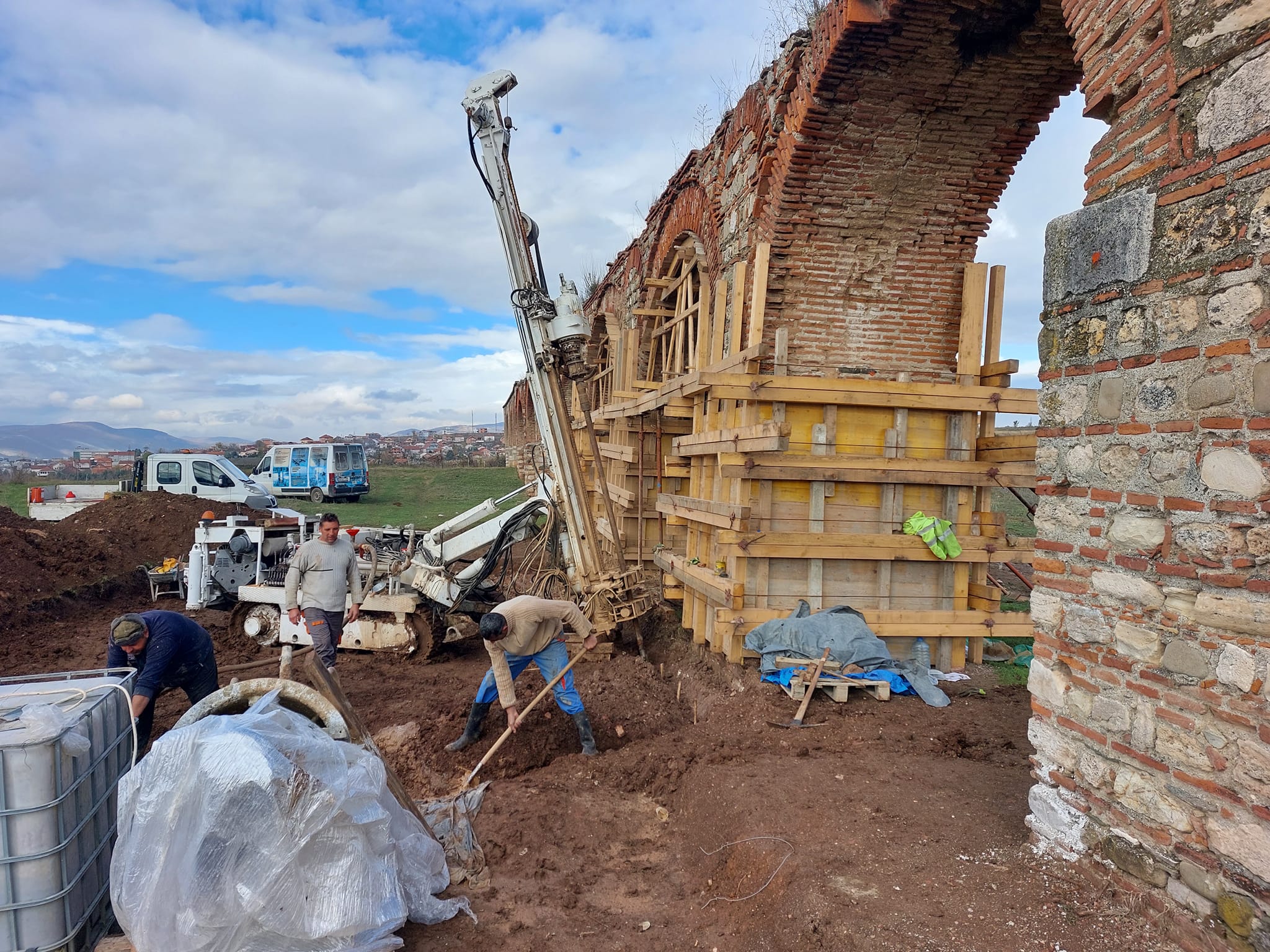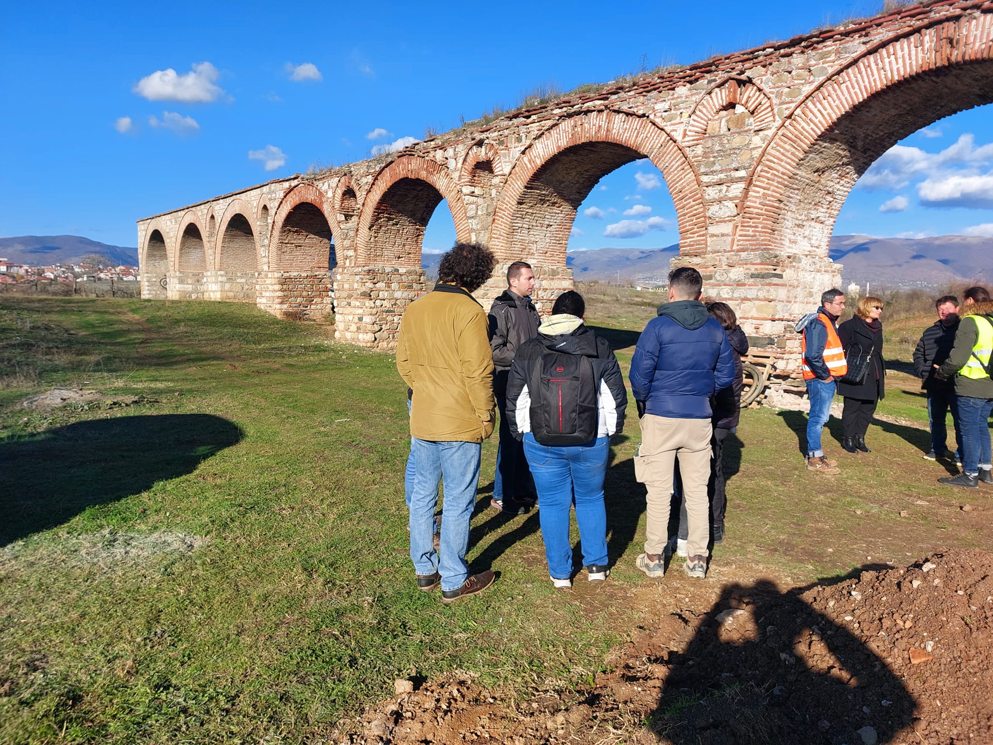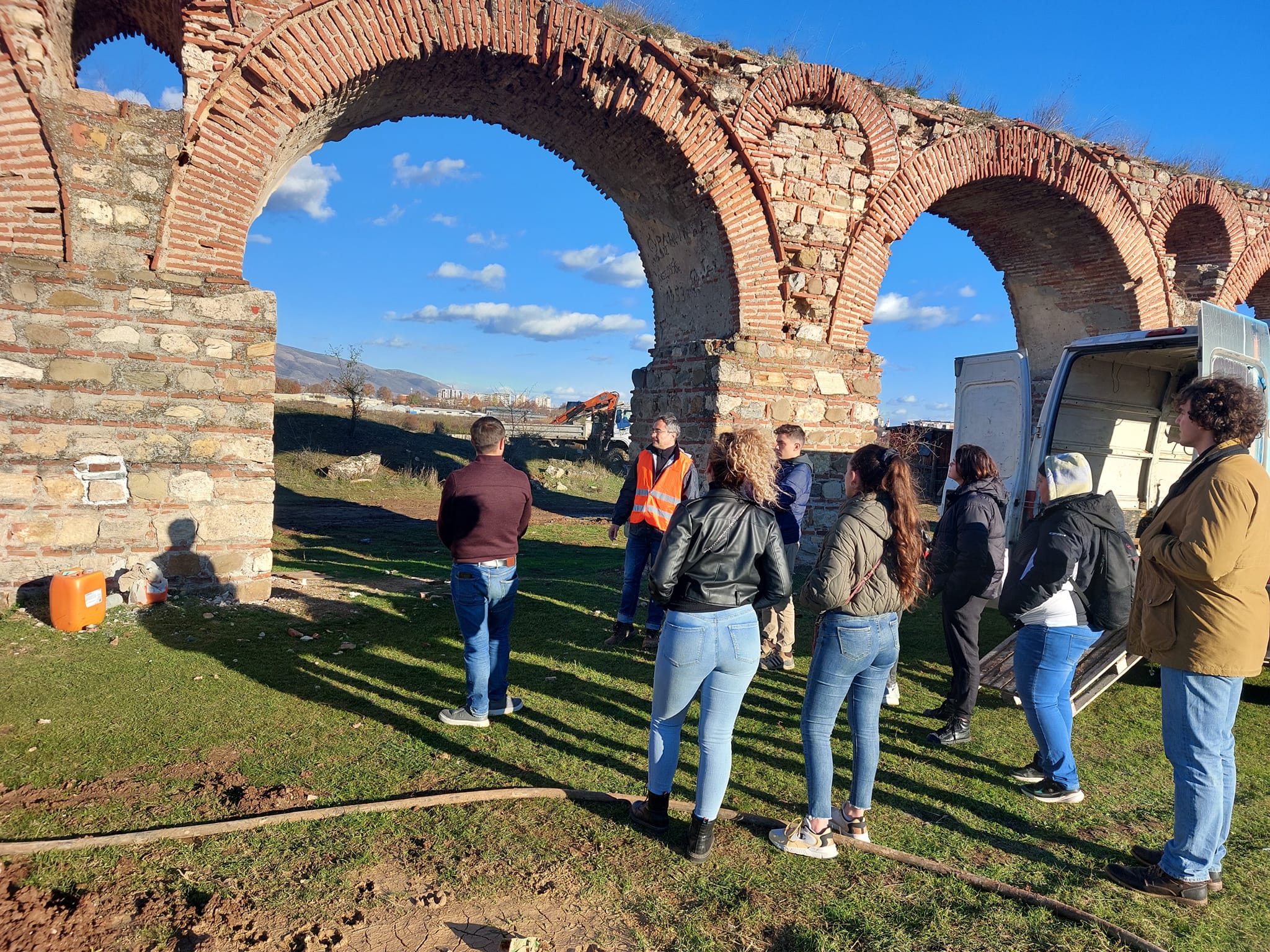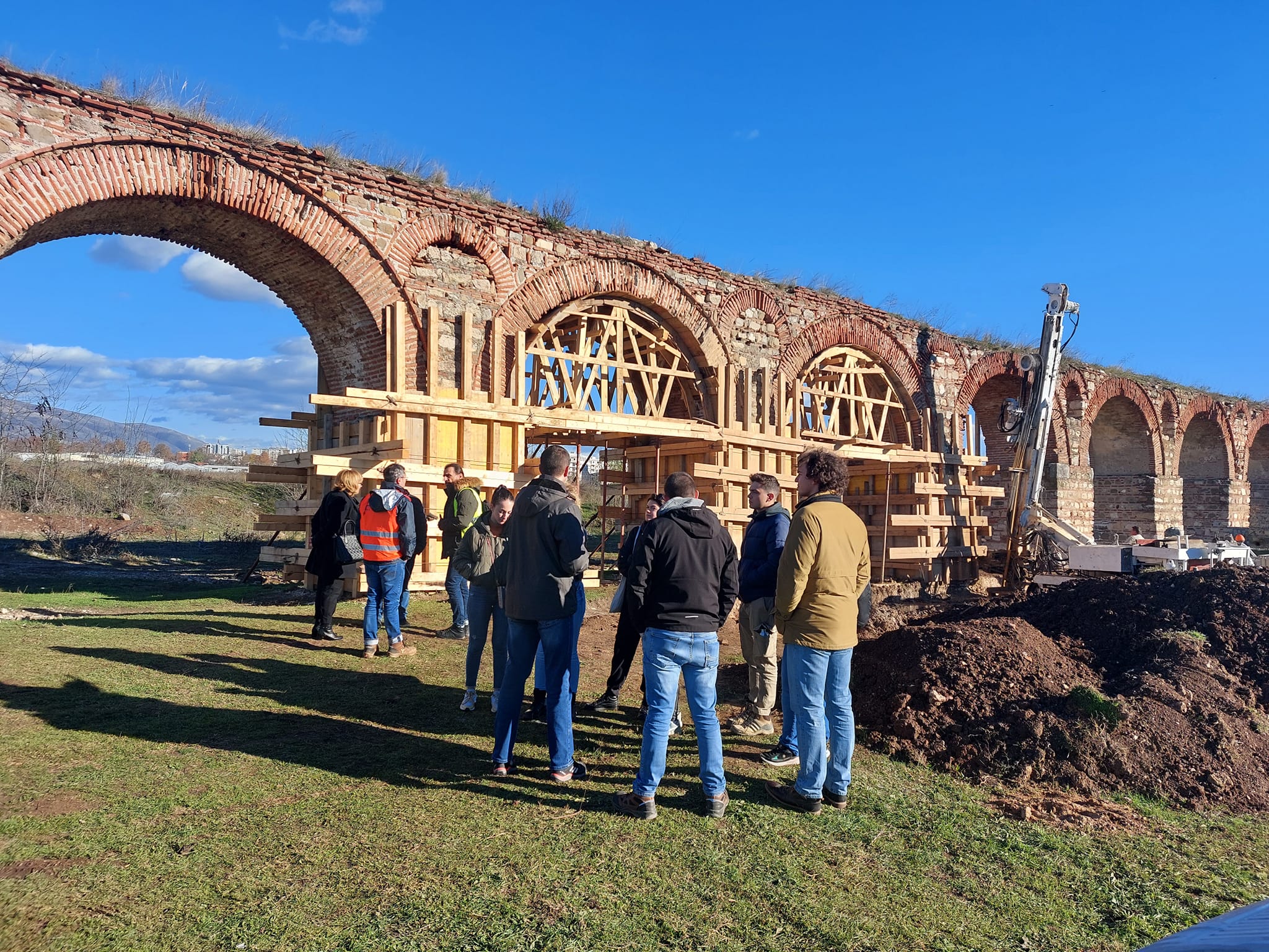 Проф. Д-р Јован Папиќ, на своите студенти им ја презентираше методологијата на вградување на микроколовите со практична примена . Начинот, постапката и примената на оваа методологија која ја изучуваат студентите, ја презентираше раководителот одговорен за реализација на поставување на микроколовите, како и Андреа Таневски – градежен надзор назначен од установата. Посетата на студентите временски се поклопи со увидот во степенот на реализација , кој го направивме заедно со Цветанка Хаџи Пецова, диа советник конзерватор – Конзерваторски надзор и градежниот надзор Андреа Таневски. Константно сме присутни на Аквадуктот со единствена цел , навремено и квалитетно изведување на работите наведени во Техничкиот опис.